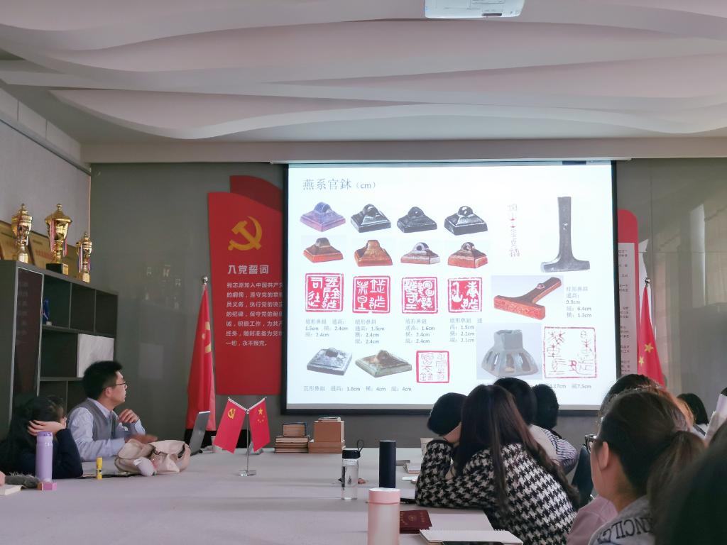 栗跃崇介绍了战国古鈢的定义、特点、分类及研究对象,分别列举了齐、燕、晋、楚、秦这几个系别中官鈢与私鈢的具体字形特征,阐述了篆刻的产生与发展。他指出,篆刻艺术是书法、章法、刀法三者的结合,是汉字特有的艺术形式。他带大家一起了解了位于浙江杭州的西泠印社,该印社是海内外研究金石篆刻历史最悠久、成就最高、影响最广国际性的研究印学、书画的民间艺术团体,有"天下第一名社"之誉。