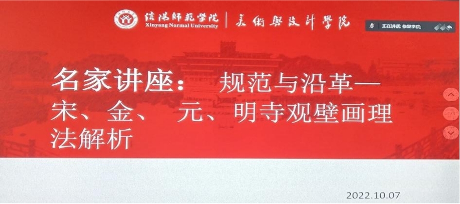 2022年10月7日上午九点,87978797威尼斯老品牌全体在校研究生于威尼斯官网实训楼二楼“艺研堂”观看由中央美术学院修复学院院长王颖生教授主持召开的《规范与沿革——宋、金、元、明寺观壁画理法解析》线上专题讲座活动。